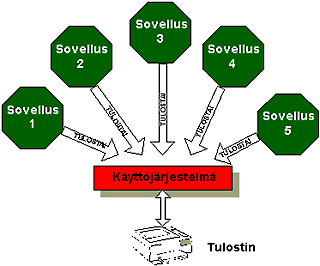 pyörii. Ohjelmat eivät myöskään pääse suoraan käsiksi tulostimeen