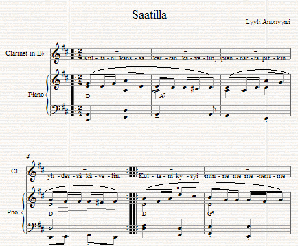 Älä välitä vielä muotoseikoista, esim. siitä että sanat menevät tuon klarinetti-stemman kanssa päällekkäin.
